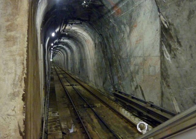 「黒部川第四発電所前」駅からは、最大積載25tのインクラインとなる。所謂ケーブルカーである。34度の傾斜で長さが815m。トンネルのはるか先に上部駅が見えるが、下部駅は標高869m、上部駅は1,325mで、標高差456m。これを約20分で登る