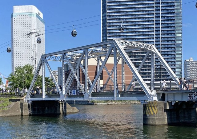 手前の橋は「港一号橋梁」と呼ばれ2基の桁橋と共に設置されていて、1909年(明治42年)に竣工したアメリカン・ブリッジ社製のトラス橋である。後方のロープウェイは、今年4月にオープンした桜木町駅と新港地区を結ぶ「ヨコハマ・エア・キャビン」