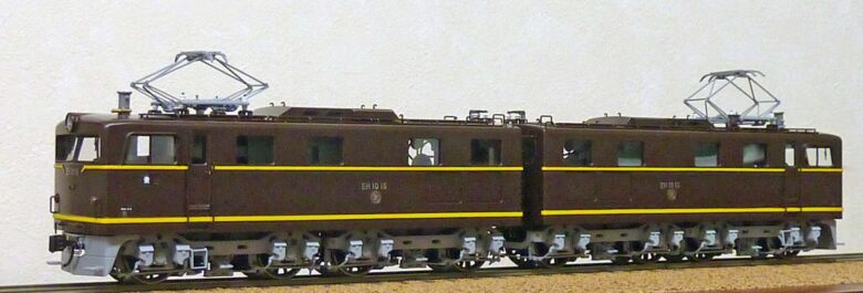 独特なスタイルと黒い車体で異彩を放つ国鉄史上最大の連接式電気機関車EH10の試作機(1~4)。パンタグラフが中央に寄っているのが特徴です。模型は4モーター8軸軸駆動、正面はロストワックス鋳造で、黄色帯は塗装にて仕上げてあります
