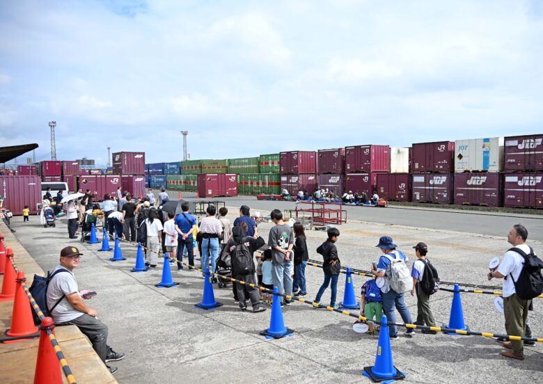 模型鉄道乗車体験には長蛇の列。私の興味は後方のコンテナなのだが・・・