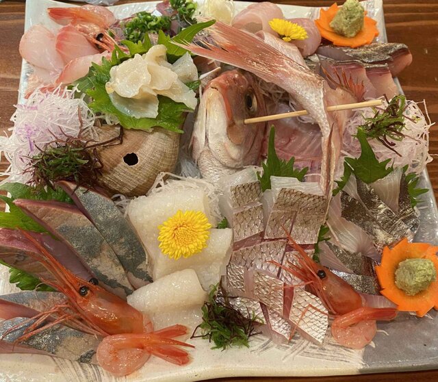 お刺身3人前。石鯛、鯵、金時鯛、鰆、バイ貝、真イカ、真鯛、イナダ、かがみ鯛、甘海老の10品