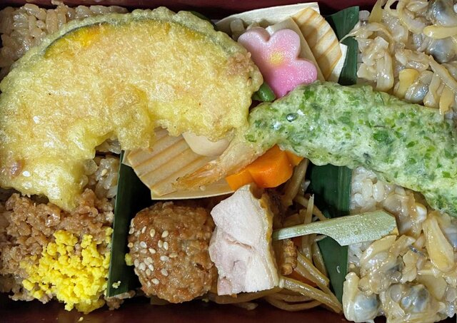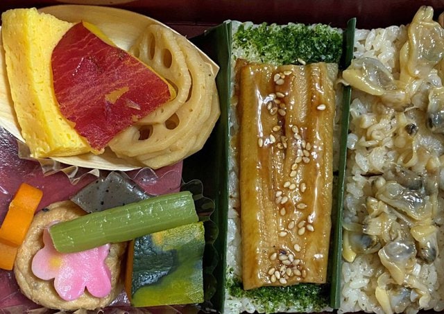 「本所深川弁当」は税込¥1,080。製造は神田明神下に店を構える「神田明神下・雅」が担当している。本所深川は長谷川平蔵が若い頃に悪さをしていた界隈。アサリ、ハマグリ、アオヤギなどの貝類とネギなどの野菜などを煮込んだ汁物を米飯に掛けたものや、炊き込んだものを深川めしとか深川丼と呼ぶので、アサリごはんが入っていてこの名前が付けられたのか