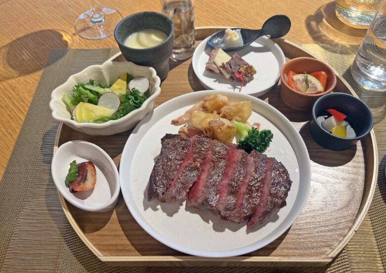 「オリエンタルプレートランチ」と名付けられたランチは中央のメインディッシュを「小岩井牛リブロースのカツレツ」「小岩井牛100%ハンバーグ」「小岩井牛赤ワイン煮込み」「小岩井牛サーロイン」「小岩井牛フィレ」「魚料理」「マテオリッチパスタ」「ローストビーフ添えのカレー」の中からチョイスする仕組みで、それによって価格も¥2,300から¥5,300まで変化する。因みに写真は「小岩井牛サーロイン」¥4,900(税込)でパンかライスが付く