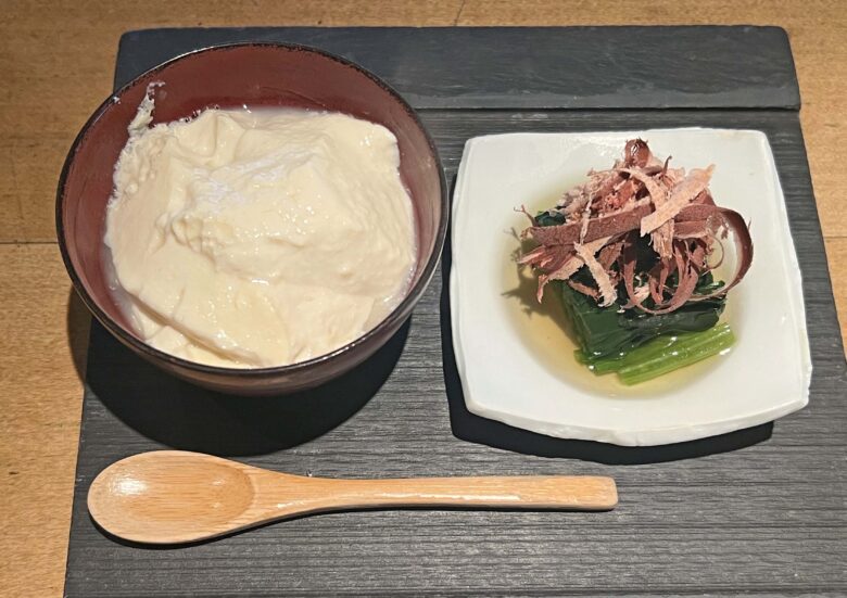 自家製豆腐とほうれん草のお浸し。削ったばかりの鰹節が美味い
