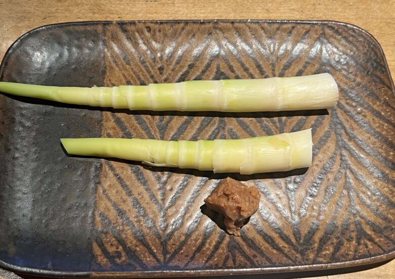 焼いた月山筍。味噌が付いていたが、塩も勧められ、試してみたがこれは圧倒的に塩