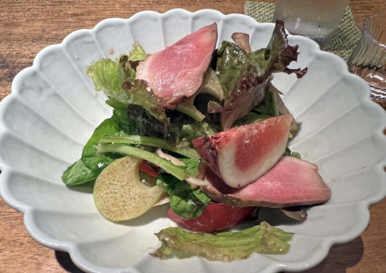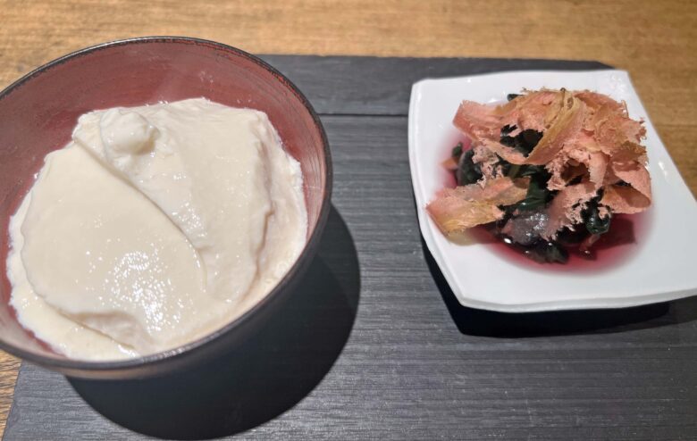 池尻の「おわん」で一杯自家製豆腐と加賀野菜「金時草」のお浸し