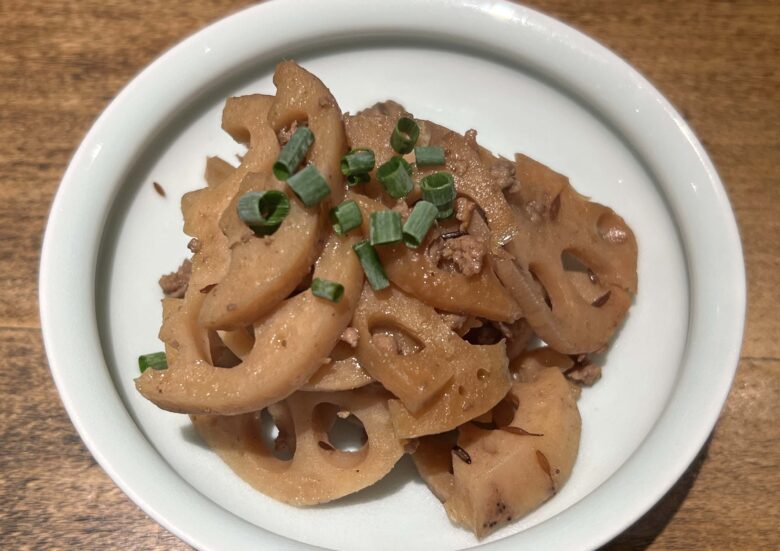 レンコンと四角豆(沖縄名:うりずん豆)のきんぴら。(四角豆はレンコンの下で全く写っていなかった)