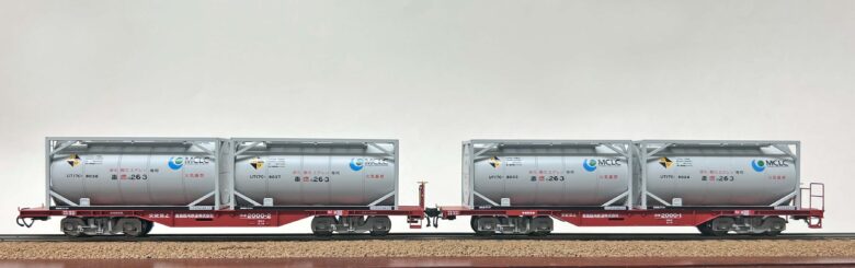 鹿島臨海鉄道のコキ2000-1(右)とコキ2000-2(左)。車体の形状から表記の位置まで全く異なる2輌。今回はタンクコンテナを積載せず、車体のみの販売です