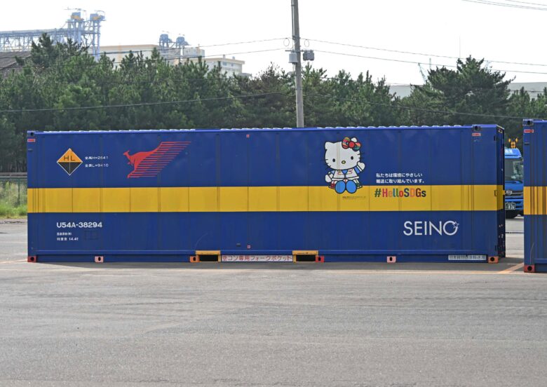 お客様からご要望が多かった、青色に黄色帯の華やかなコンテナです 仙台臨海鉄道仙台港駅にて 2025年10月