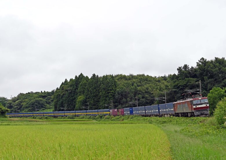 「カンガルーライナーSS60」は、大阪の吹田貨物ターミナルと仙台貨物ターミナル間を運行しています。牽引機はEH500 8 東北本線松川~金谷川間にて 2020年9月