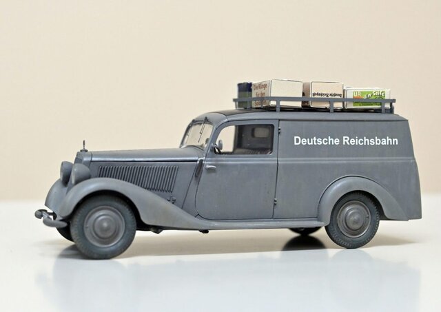 模型はプラスチックキット(市場価格¥4,000程度)で、1/35スケール「ドイツのデリバリーカー170V」としてミニアート社より発売されている。色々な会社名のインレタがキットには入っているが、かなり地味な「ドイチェ・ライヒスバーン(ドイツ帝国鉄道)」を選択。模型の全長は12.5mm