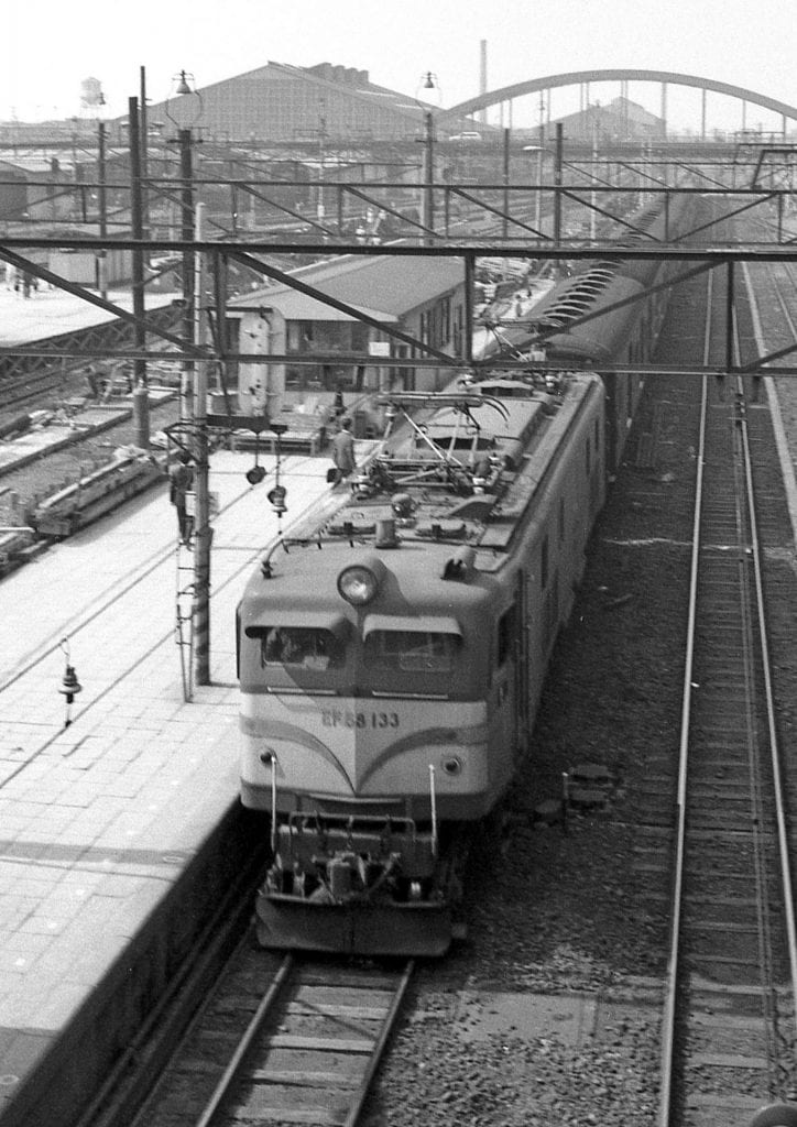 EF58 133号機牽引の高崎線上り普通列車。後方に見える大きな屋根は、国鉄大宮工場