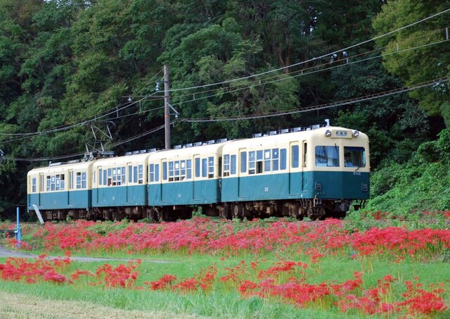 連接台車を履いて3輌固定編成の北勢線200系(前3輌)。現在は、北勢線開業100周年記念の旧北勢線カラーに塗られていて、電装解除はされたものの往時の貫録を残していて堂々たる姿である 楚原~麻生田