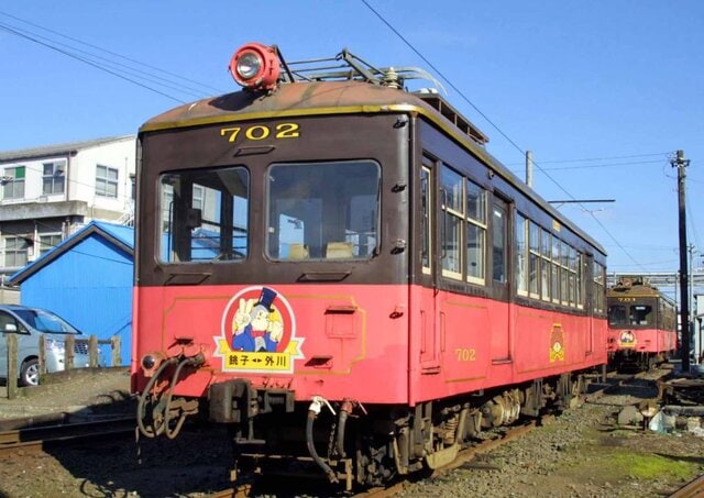 2007年11月の全検時に、1960年代の銚子電鉄色に塗装が施されたデハ700形702 2010年(平成22年)1月 外川駅