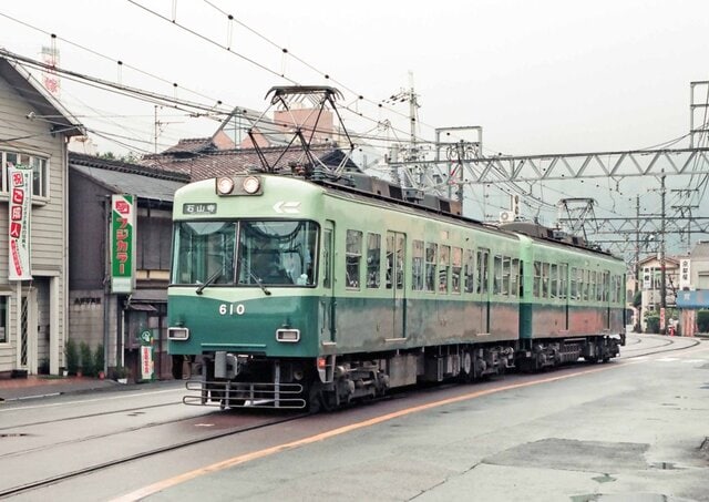 浜大津~三井寺間の軌間1,435mm併用軌道をいく京阪600形610・609。609以降は前面がパノラミックウィンドウになった