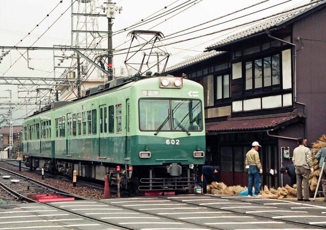 京阪600形605・606。601~608は、前面の窓に平面ガラスを使用している。浜大津駅(現在は、びわ湖浜大津駅)を出発すると、いきなり交差点の併用区間に入る