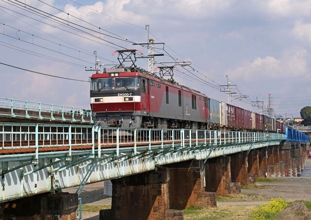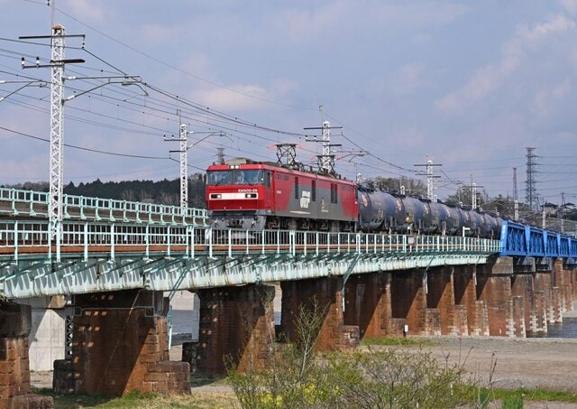 橋脚はレンガ造りで、隅石飾りと三角水切りが付いている土木的にも貴重なもの。EH500 28号機牽引のタンク列車は、川崎貨物駅行き