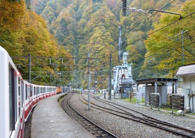 黒部峡谷鉄道の始発駅「宇奈月温泉」より長編成の工事関係者専用列車に乗り、秋が深まりゆく黒部峡谷鉄道「猫又」駅を行く。猫又には、黒部川第二発電所がある