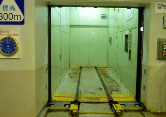 欅平駅から線路の引かれた薄暗いトンネルを数百メートル歩くと、内部にまでレールの引かれた4.5t竪坑エレベーターがあり、標高600mの欅平から標高800mの欅平上部駅まで運び上げてくれる