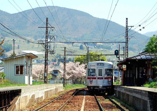 夜間瀬(よませ)~上条間の1000系。2007年ゴールデンウィークの湯田中周辺は快晴の天気に恵まれ、桜、桃、芝桜、水仙などの花が一斉に咲き誇り、まさに春爛漫