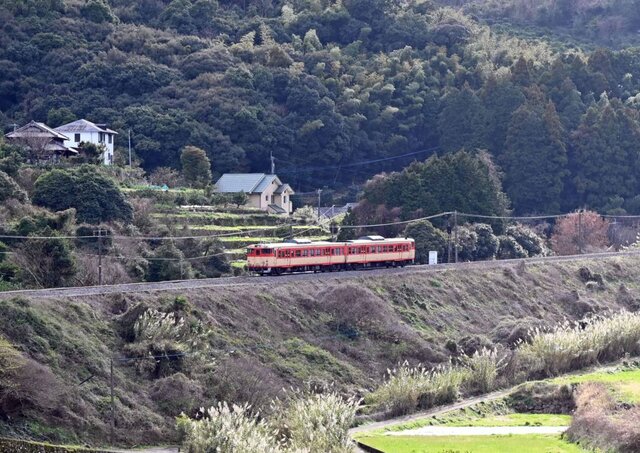 山川内地区を分断するダムの様に高い築堤をいくキハ66・67