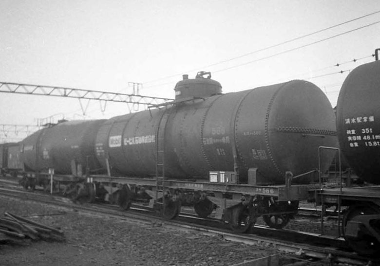 大正生まれの三軸貨車は、モービル石油のタサ566(形式タサ500)。強烈なリベットが目をひく