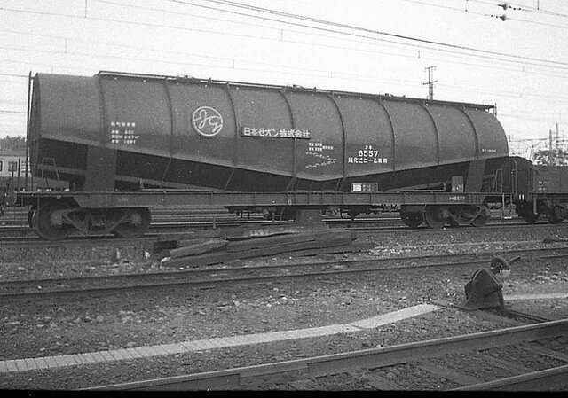 塩化ビニール専用の日本ゼオン所有タキ6557(形式タキ6550)。ホッパー車のような外観