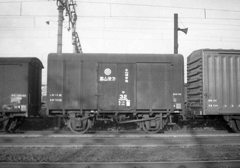 富山地方鉄道のテ32(形式テ30)。国鉄線直通運用の出来る私鉄所有貨車には番号の下に二重線が付けられた