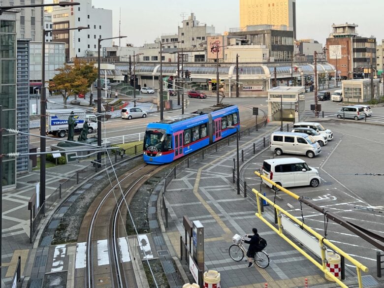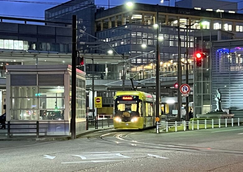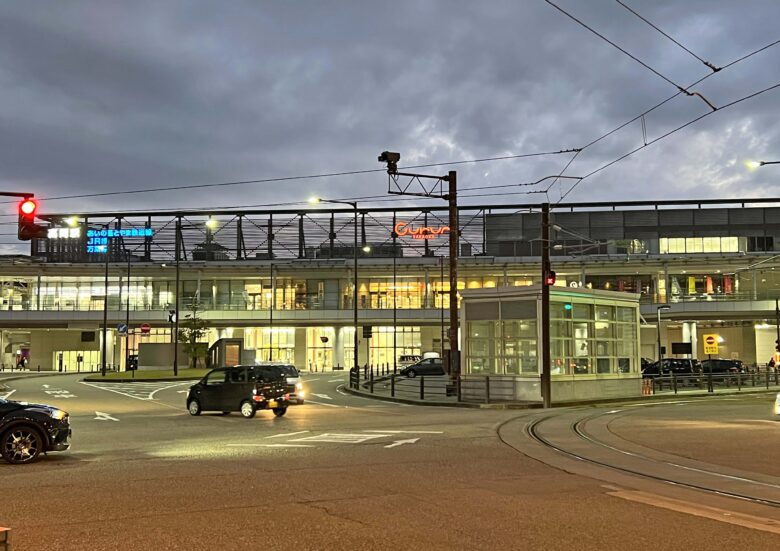 高岡軌道が駅前通りからSカーブを描いて駅の真下にまで進入している。利用者の乗り換えには便利で、中々の駅前だと思ったのだが・・・