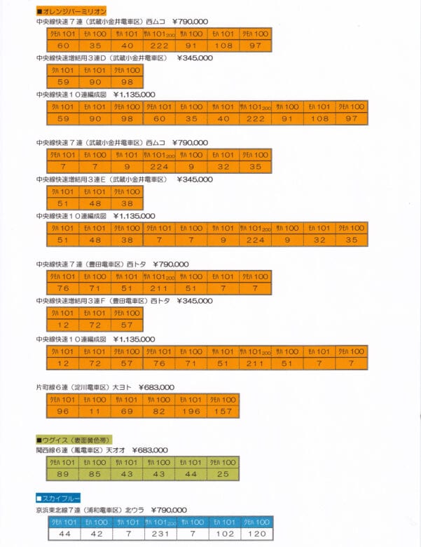 製品は全て特製完成品となります。予価及び編成車番表は下記の通りです。尚、予定台数となりましたので、予約の受け付けは終了させていただきます