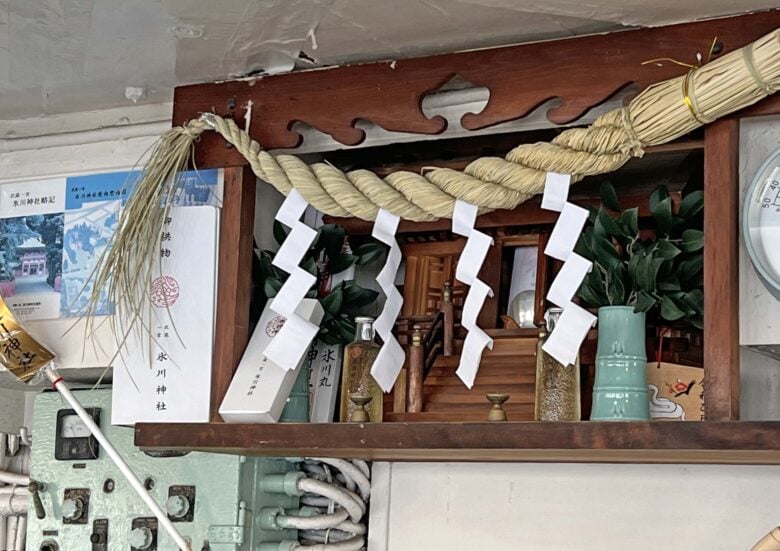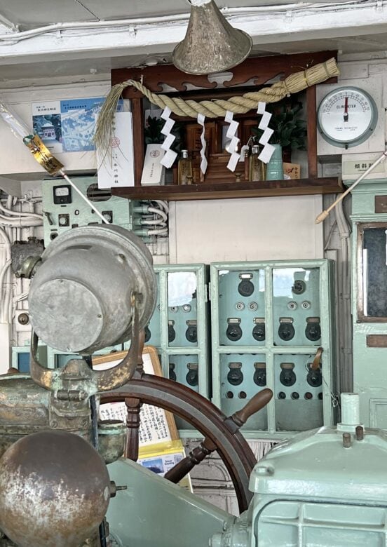 氷川丸の操舵室にある舵の後方には大きな神棚。祀られているのは・・・