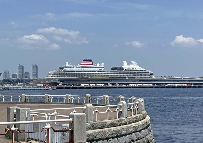 氷川丸から大桟橋を見ると、氷川丸と同じ日本郵船のファンネル(煙突)マークを付けた「飛鳥Ⅲ」が見える。「飛鳥Ⅲ」は4月にヨーロッパで引き渡され、回航されて6月に母港・横浜に入っていて、7月には処女航海が予定されている