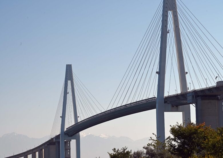 海王丸パークの一角にある新湊大橋、後方には初冠雪した立山連峰が望める