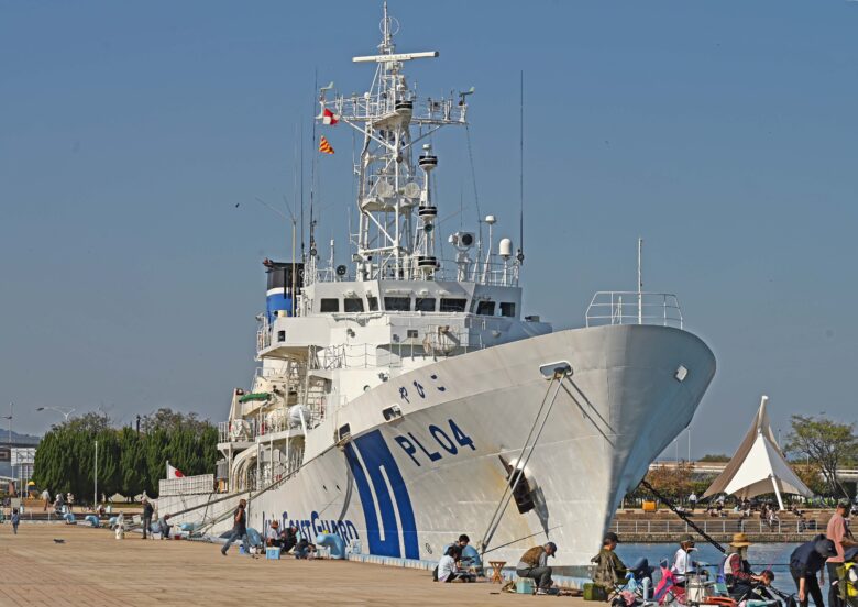 港内の海王岸壁に停泊する海上保安庁の巡視船PL04「やひこ」。岸壁は家族連れの釣り客で賑わっていた