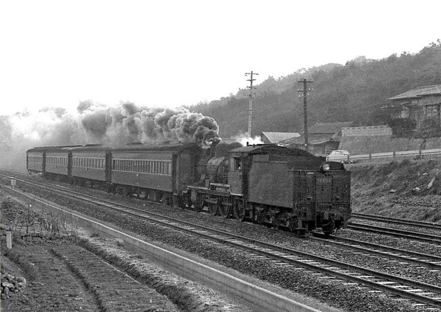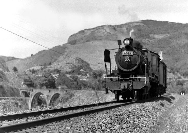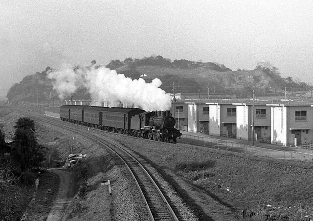 中間(なかま)~折尾間の複々線は、途中で中2本がクロスしていて、折尾駅を経て若松に向かう列車と、折尾駅をスルーして小倉に向かう列車を振り分けていた。ストリート・ビューで確認すると、右に写る団地は現在もそのままの様であるが、奥にある丘陵部の森は全て住宅地となり、左側には新駅が出来ていて、この立体クロスも存在していなかった。写真は若松機関区の8620形38634 1970年(昭和45年)3月