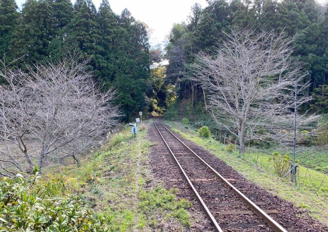 ホームから月崎駅方面を見ると、やはり、桜が植えられていて、線路は林の中に消えている