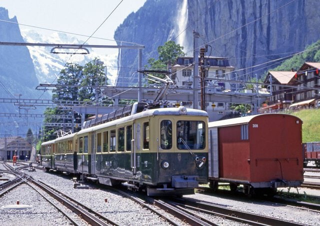 ラウターブルンネンは、ウェンゲンアルプ鉄道への乗換駅。車両の後にシュタウプバッハの滝が写り込む 1992年(平成4年)7月