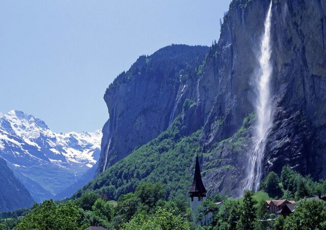 シュタウプバッハの滝は高さ約300m。この断崖の上に、道路が下界とは一切つながっていない孤立した村、ミューレンがある 1992年(平成4年)7月
