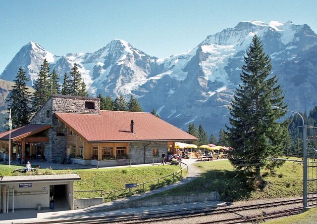 このレストランの売りは、ベルナーオーバーランド三山(左からアイガー、メンヒ、ユングフラウ)を間近に見ながら食事が出来る事。そしてこの景色が人口数百人の孤立した山村ミューレンに観光客を呼び込む事になった