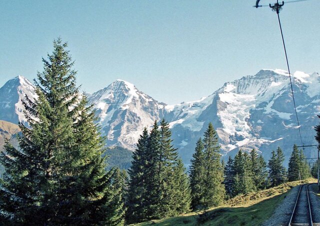 BLMの車窓からもベルナーオーバーランド三山は充分に楽しめる。終点ミューレンとラウターブルンネンとの高度差は860m 1997年(平成9年)10月