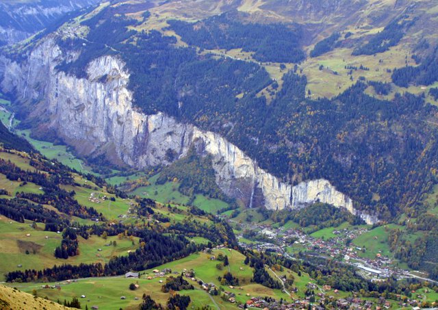 メンリッヘンから見たラウターブルンネンの谷。白く写る断崖の右端下に見える街並みがラウターブルンネンで、シュタウプバッハの滝は町の左上に見え、断崖上の左端にミューレンの集落が微かに望める。ラウターブルンネンからミューレンに行くには崖上のグリュッチュアルプまでロープウェイに乗り(2006年まではケーブルカーであった)、そこからラウターブルンネン・ミューレン山岳鉄道(BLM)に乗らなければならない 2001年(平成13年)9月