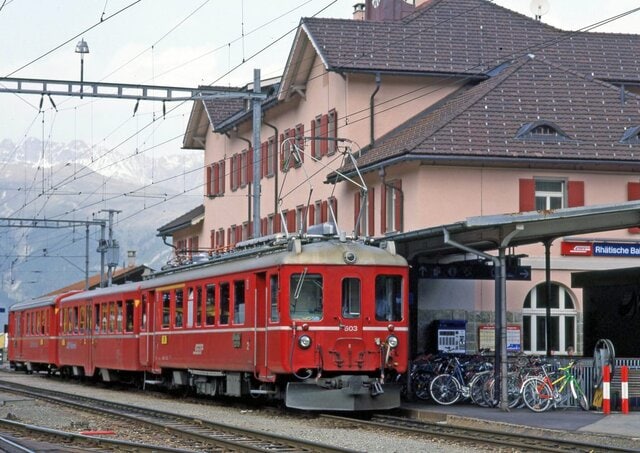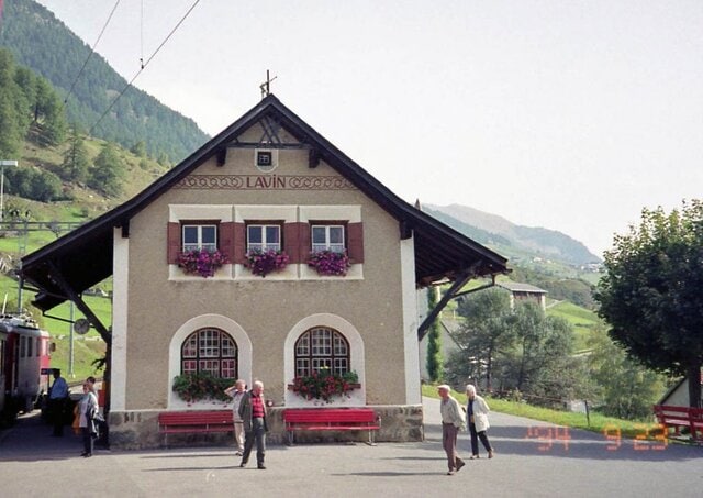 レーティッシュ鉄道(RhB)のアルブラトンネルに向かう主幹線とエンガディン線の分岐駅ビバー。エンガディン谷にあるとは言えこの駅は別格で、やはり幹線駅は立派である 1994年9月