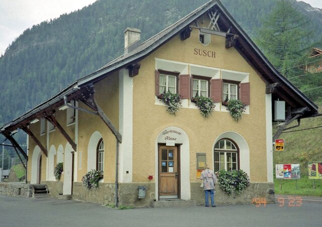 こちらはスイスからイタリアまで国境を越えるレーティッシュ鉄道ベルニナ線のポントレジナ駅で、イタリアに近くなると駅舎も華やかになる。イタリアのポスキアポまで走るベルニナ線は世界遺産に指定されている 1994年9月