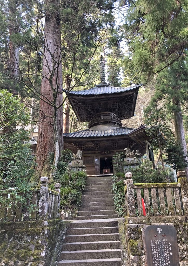 境内の奥に進むと、再びうっそうとした杉林で、出羽の羽黒山を思わせる。杉の木の太さも半端でないが、階段の多さも半端ではない。写真は多宝塔