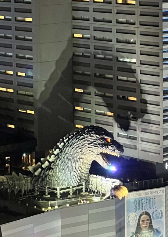 ゴジラの影がホテルの壁面に映し出されていて、影の方が不気味な雰囲気