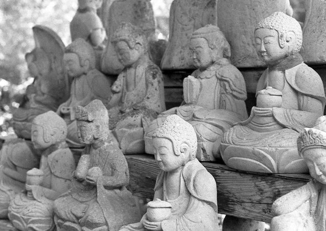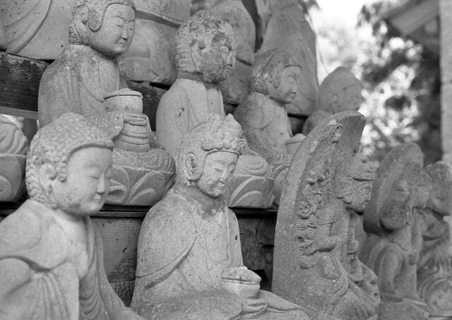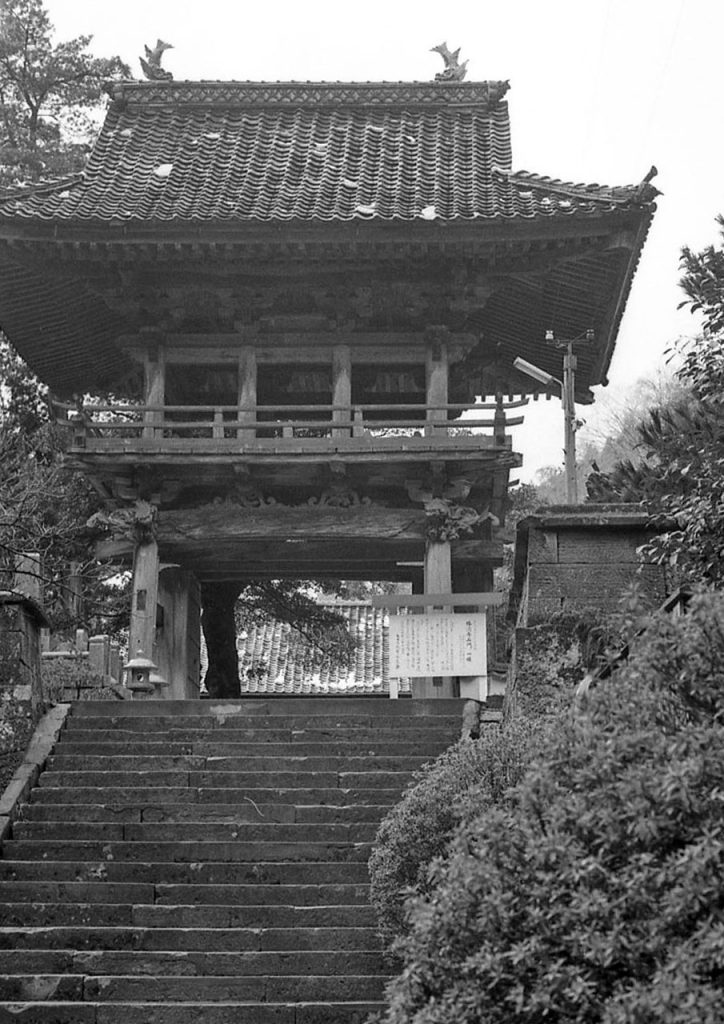 苔に覆われた石造物が多数みられるこの街には、驚く程に寺院も多く、江戸時代の繁栄が偲ばれる。銀峰山清水寺(せいすいじ)山門も左右に石像が並ぶ
