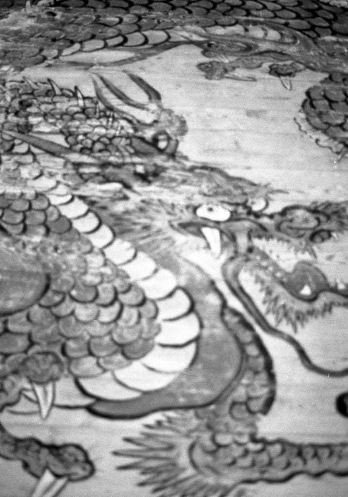 即応山勝源寺の山門は外壁がなく、山門の天井に描かれた龍が凄い