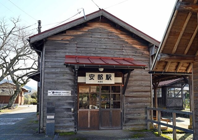 建物も異質だが、読み方が難しいこの地域の駅名の中で「安部」とは単純で異質である。どうも駅名で地元が対立した際に日下部地区と安井宿地区から1文字づつ取って作った駅名の様で、地元の地名に「安部」はない。建物の裏側は倉庫なのだろうか板戸となっていて、建物の中には現在「理容室」が入っていて営業中である