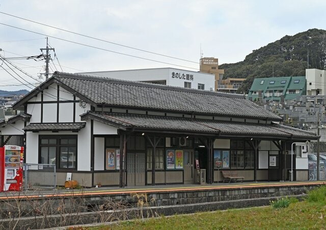 1972年(昭和47年)の新線開通により交換設備が撤去されて単式ホーム1面1線となったが、相対するホームがそのまま残されていて、付近の町並みからタイムスリップしたような駅舎である 2021年(令和3年)1月