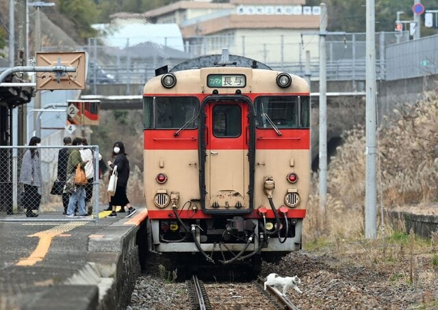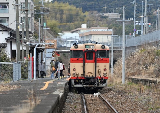 周りの世界とは隔離されたような駅で、ゆっくりと時間が流れている気がする。列車が停車すると、ネコがゆっくりと線路を渡りだした